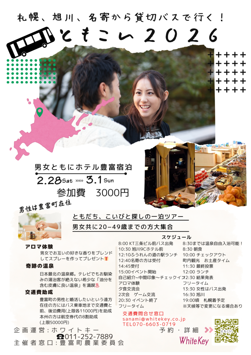 札幌発貸切バスで行く豊富町一泊交流会 「札幌・旭川・名寄経由バスツアー・奇跡の湯豊富温泉宿泊ともこい」 ともこい/Whitekey AI matching/カップリング有り