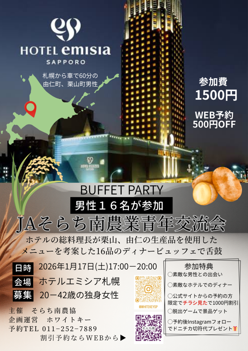 そらち南農協青年との食事交流会!ゲームと特産品グルメで距離縮まる♪ 食事と飲み放題つき/Whitekey AI matching/カップリング有り