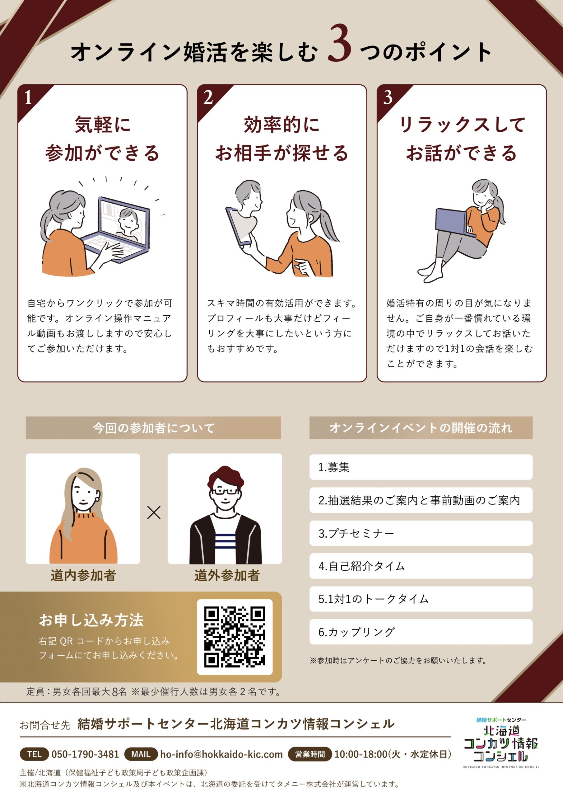 北海道コンカツ情報コンシェル主催の、オンライン婚活イベントを開催いたします。 オンライン婚活は全てオンラインで完結するため、 気軽に参加し、隙間時間も利用しながら、お相手を探すことができます。 一対一の会話 […]